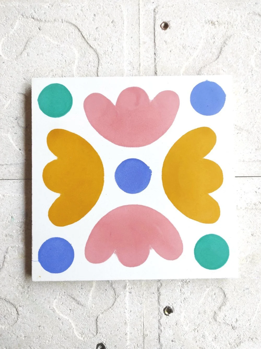 Le motif est décliné en plusieurs variantes colorées, cette collection se compose de carreaux multicolores,